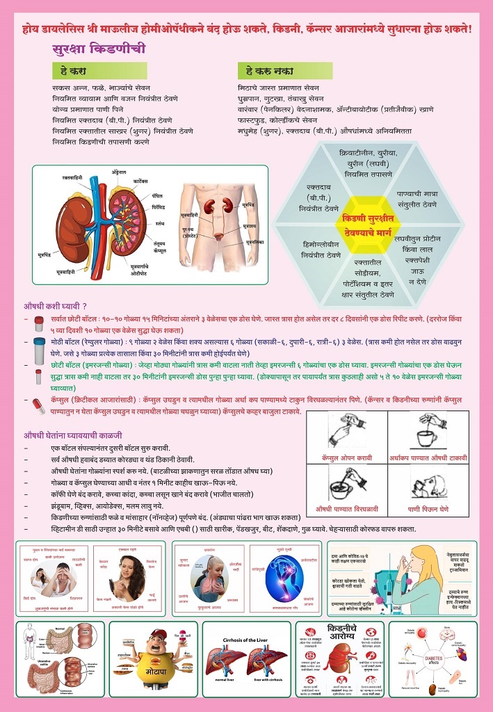 मला किडनीचा त्रास असुन माझे क्रियेटीन २२ व ऑक्सिजन ८६ होता. मला जीव घाबरणे, उलटी, मळमळ, थकवा, अशक्तपणा जाणवत होता, अन्न पचन होत नव्हते, लघवी साफ होत नव्हती, बीपी जास्त राहत असे, ५ वेळा डायलेसिस केले होते, पण श्री माऊलीज होमिओपॅथीच्या औषधीने २०१४ पासुन डायलेसिस पूर्ण पणे बंद आहे. बाकीचे सर्व त्रास बंद झाले.